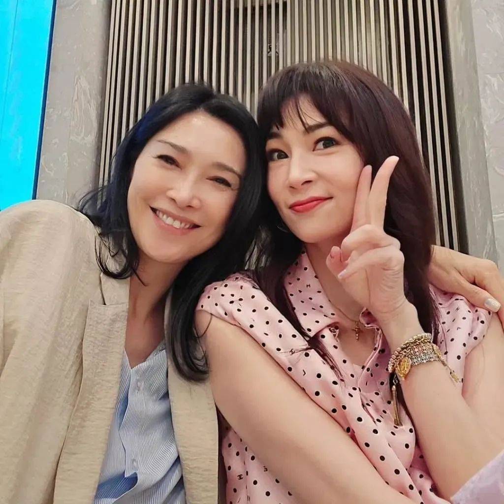 照片中,两人超级亲密地头贴头并望着镜头笑,卢淑仪留着一头黑色长发,身穿一件卡其色西装外套,以浅蓝色衬衫作为内搭,亲切地将手搭在邱李茂琪的肩上。