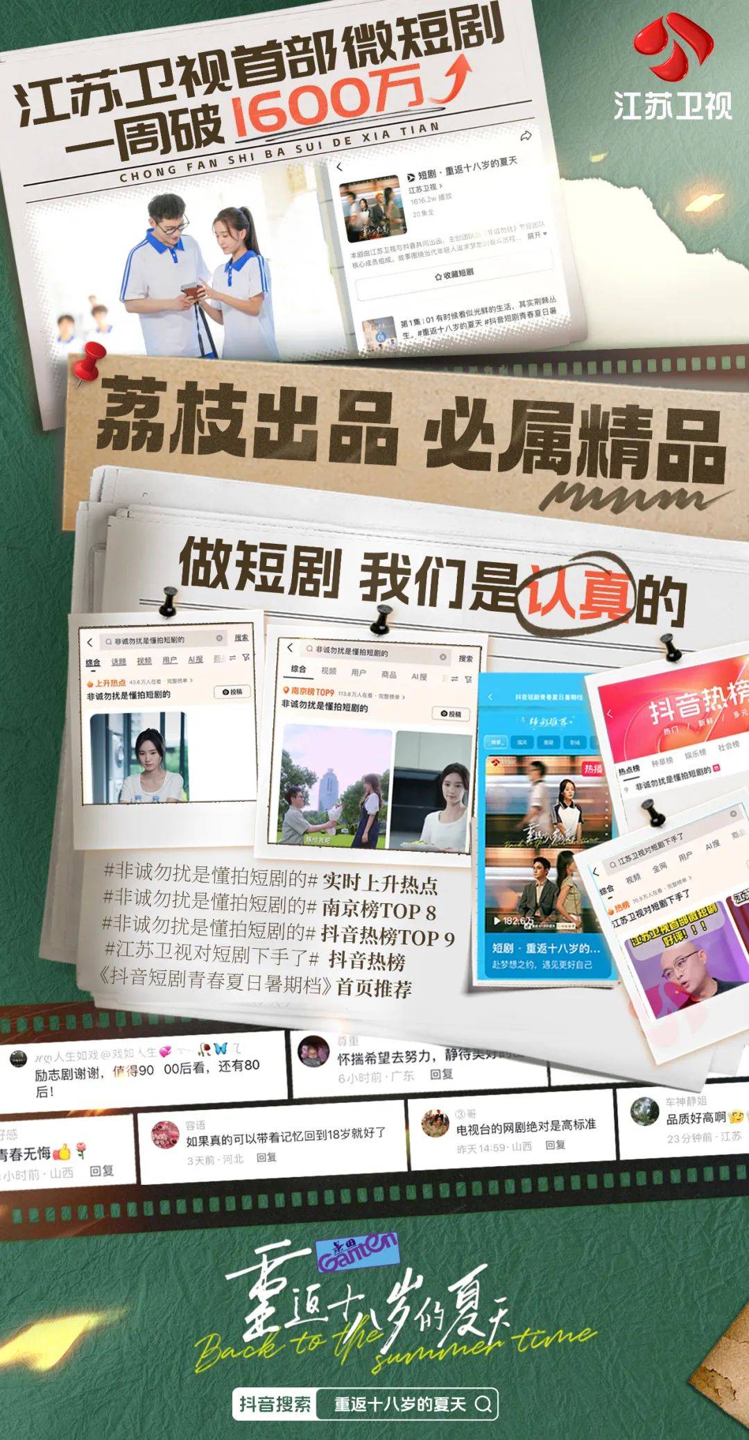 从布局微短剧赛道,到成功打造首部自制剧集,再到通过与品牌携手探索微短剧商业化路径,《重返十八岁的夏天》的火热播放和良好口碑,既展现了江苏卫视在内容创作领域和情感类题材长期积累的优势,也以“微”为不弱、“短”而不浅的原则,打造了精品微短剧的行业新标杆,进一步引领行业发展。