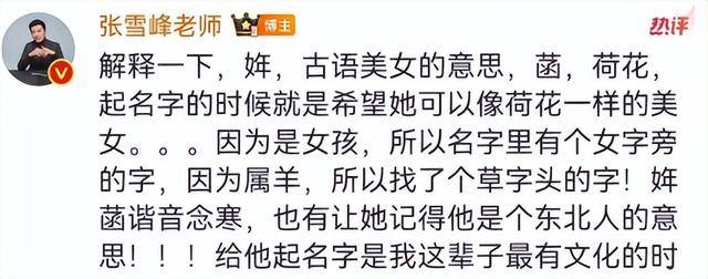 张雪峰他闺女呢,大名叫张姩菡。9 岁的小姑娘,说起自己名字来那可老明白了。“菡就是荷花的另一个叫法。我妈希望我跟荷花一样美,出淤泥而不染。加上草字头呢,是因为她属羊,希望她能吃饱饭。那个姩呢,就是老早以前说美女的意思。” 瞅瞅,这小姑娘嘴可老会说了。她不光嘴会说,还有自理能力呢,爱好也可多了,精神世界老丰富了。