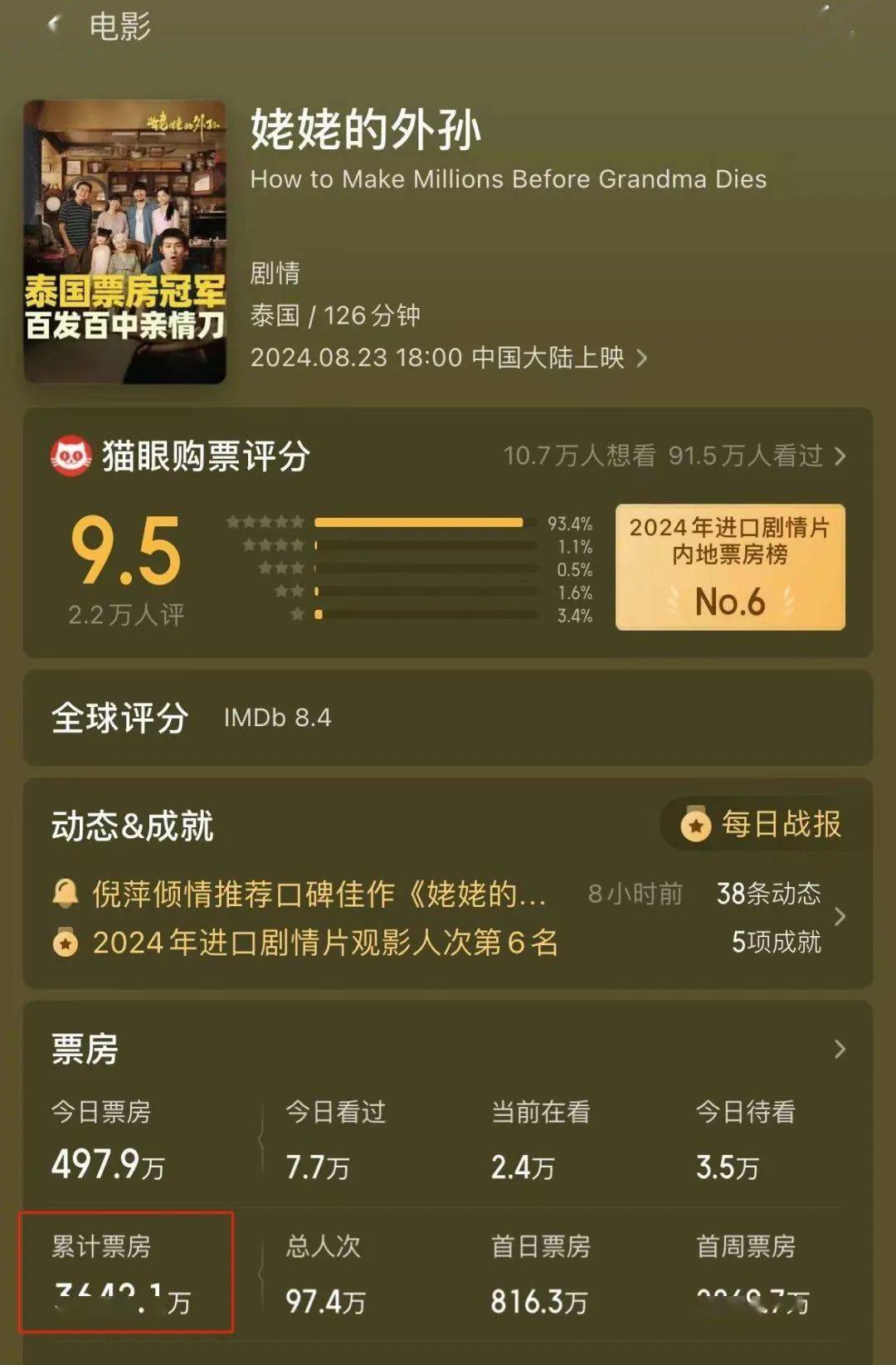 豆瓣9.0,口碑榜第一,截至发稿,《姥姥的外孙》票房破3600万,暂列泰国电影在中国电影市场票房第四位。票务平台预测其总票房将超1亿,或将在中国内地创造仅次于《天才枪手》的票房纪录。