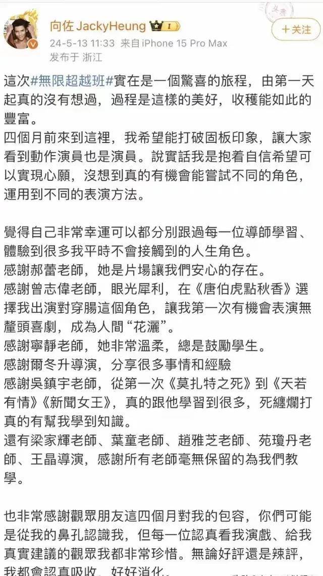 向佐退赛后的长文,更是把这事儿推向了高潮。满屏的繁体字,字里行间透着一股子“委屈”和“不满”。他说自己三天内无法突破自己,还暗示导演不让他拿麦克风,言下之意就是节目组故意为难他。但事实呢?看了节目的观众都知道,向佐在舞台上的表现确实和队友们有差距,而且他的态度也让人无语。遇到问题不是想着怎么解决,而是直接逃避,这样的行为真的很难让人信服。