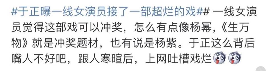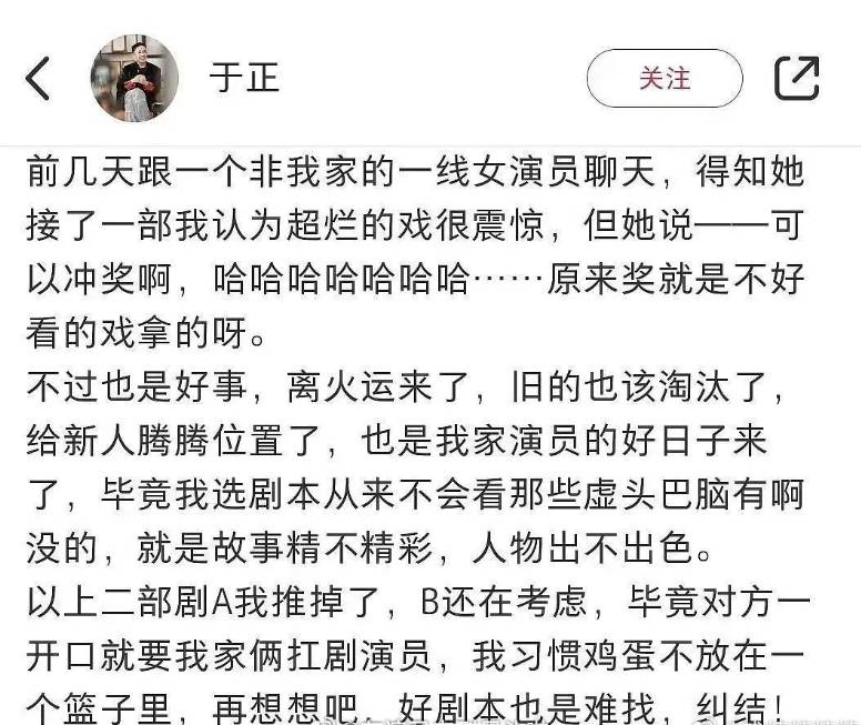 8月27日,一则名为“于正曝一线女星接烂剧”的词条被推上热搜,于正本人发文爆猛料,说自己前几天和一位一线女星聊天,得知对方接了一部超级烂剧,自己震惊原因时,却被对方告知可以用来冲奖。透露和好友聊天细节不说,还不忘嘲讽奖就是不好看的戏拿的。