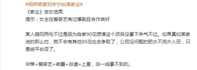 其次,杨紫也是公认的一线女星,而且刚被曝接下了大女主剧《家业》,搭档当红现身刘宇宁,相比古偶题材,这部剧还是有冲奖可能的。有句话叫作“祸从口出”,于正这番操作虽然给自家艺人博得了曝光,但是却殃及了杨紫和杨幂,不管是不是她们,想必以后朋友都不敢给他聊过多私事了。