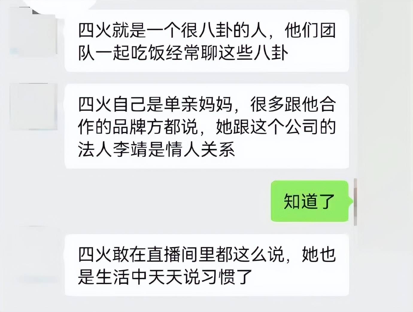 随着此事的发酵,四火姐姐也受了牵扯,网上有人曝出了聊天记录,说四火日常生活中是一个非常八卦的人,他们的团队一起吃饭时也喜欢聊这些事,直播间敢这么说,证明平日里也是说习惯了。