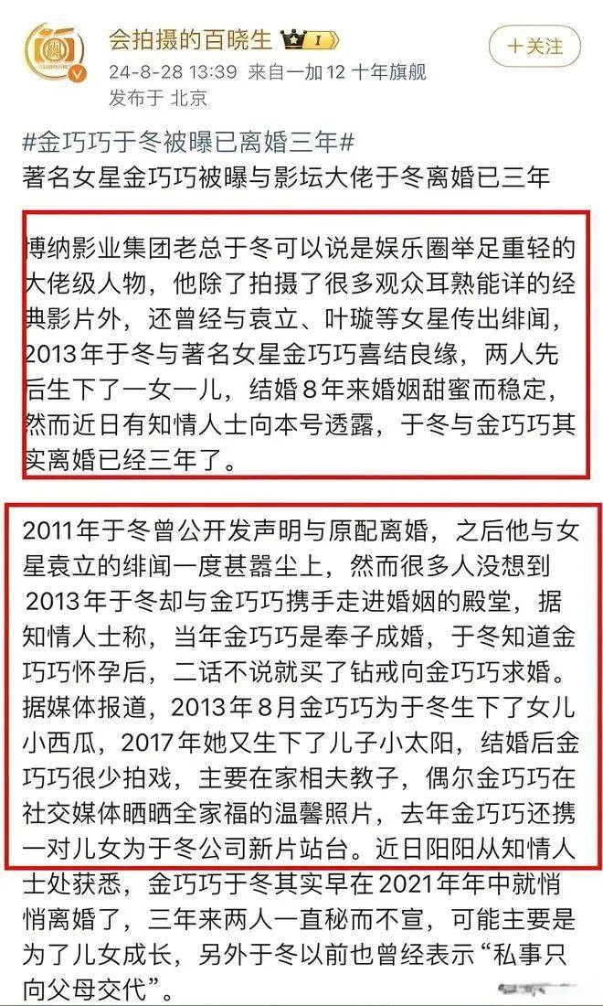 而且在去年金巧巧还曾带着一双儿女为于冬的新片站台,上演着恩爱夫妻,但没想到真实两人关系其实早已离异。据悉金巧巧与于冬是在2013年结婚,如果是三年前离婚那就是2021年,两人的这段婚姻维持了八年。