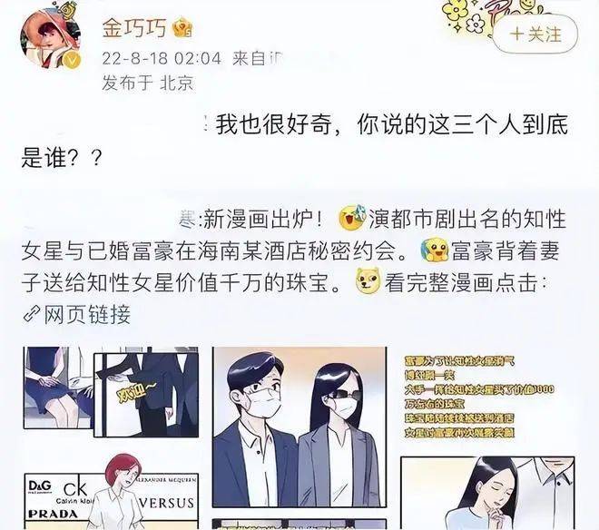 不过很快金巧巧就对此事做出回应,直接硬刚爆料者,转发了这张漫画图并评论称:“我也很好这三位究竟是谁?”而且还在评论区直接喊话造谣者,称自己不会接受网络上的无端诽谤,并呼吁网友们吃瓜时要保持理智不要轻信谣言。