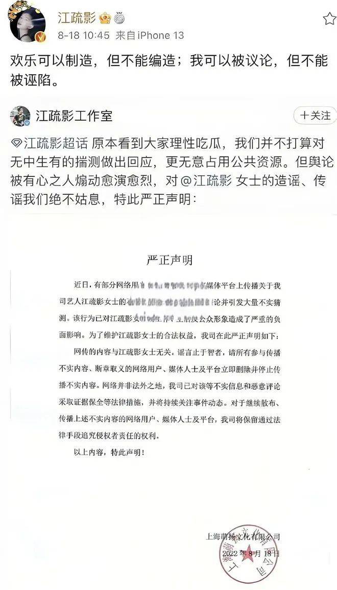 随后江疏影工作室也发表声明否认,称该爆料纯属捏造并将通过法律途径维护自身权益。随后江疏影本人也转发了工作室的辟谣声明,并为自己喊冤:“欢乐可以制造,但不能编造;我可以被议论,但不能被无限。”