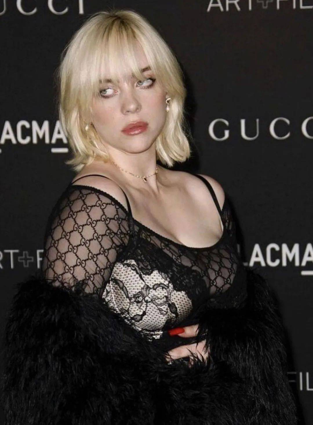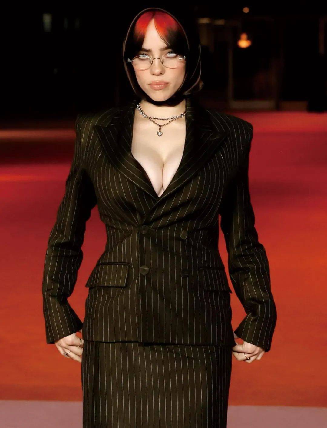 很多人因为Billie Eilish展露身体的做法,将其视为向社会和资本妥协的背叛者。但“改头换面”后的她其实从未背弃叛逆的心。她也曾顶着蓬松乱发和黑眼圈,身穿Gucci高开衩蕾丝睡衣,搭配浴袍、眼罩和拖鞋,“闯”入2022年洛杉矶艺术博物馆慈善晚会。