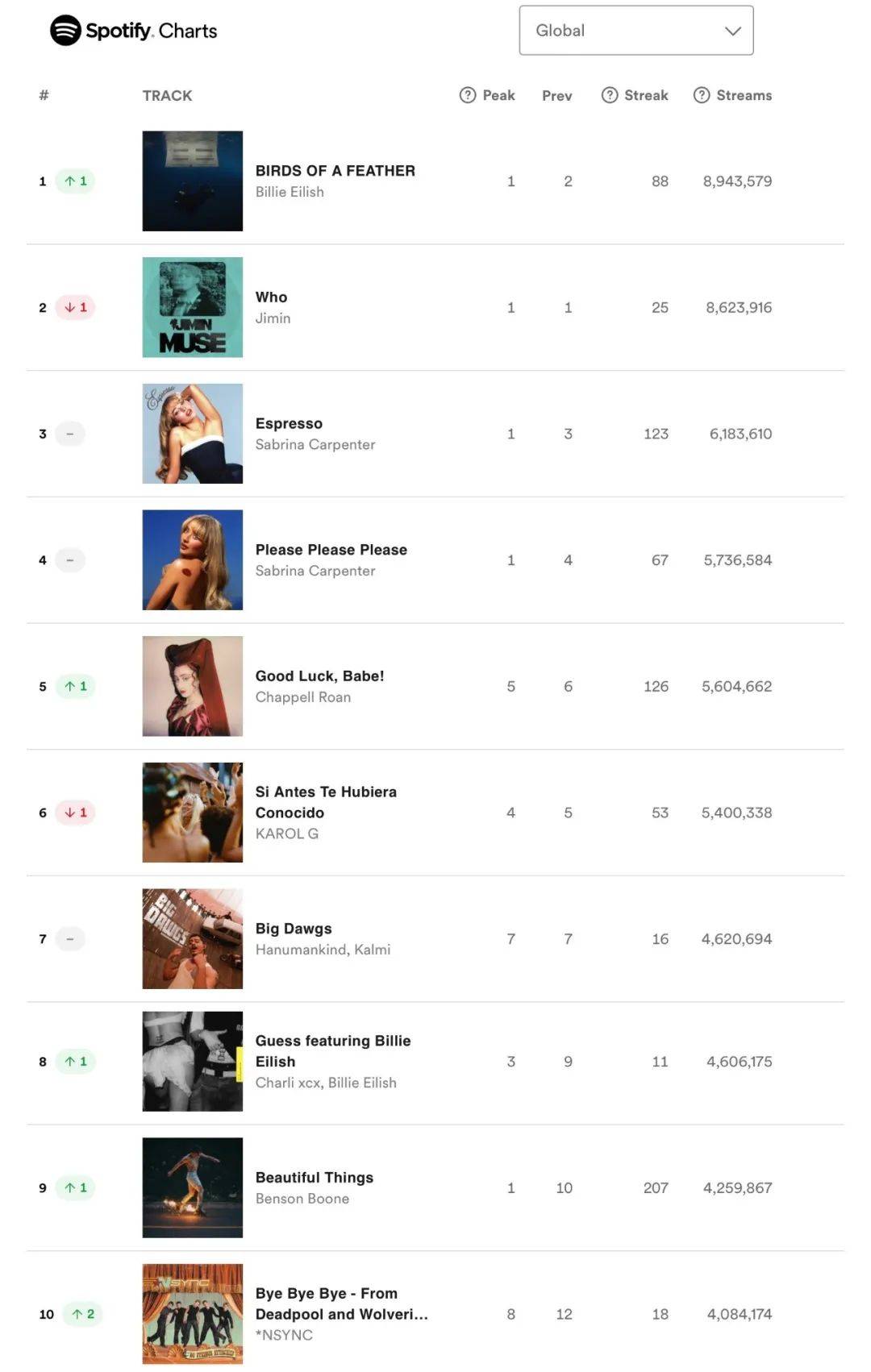 《BIRDS OF A FEATHER》有多火?看音乐平台的堪称“恐怖”的数字就知道了——不但登顶Apple Music全球单曲榜,同时在Spotify全球榜以894万3579次流媒体再夺冠军宝座。目前,该曲已在排行榜首位停留了二十多天,总播放量突破27亿次。这是她自《Bad Guy》以来第一首达到此成就的单曲。说是今夏最爆单曲不过分吧?