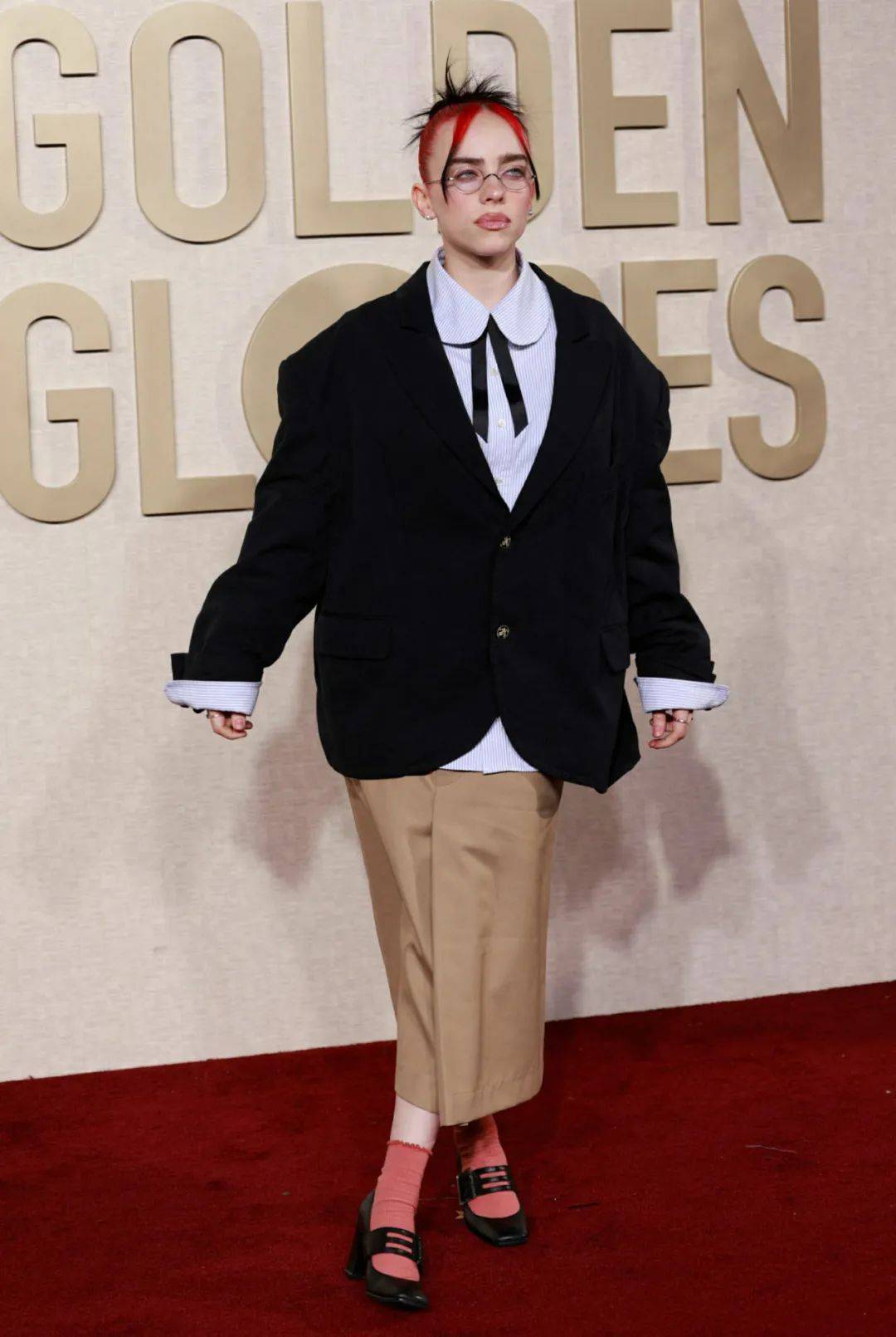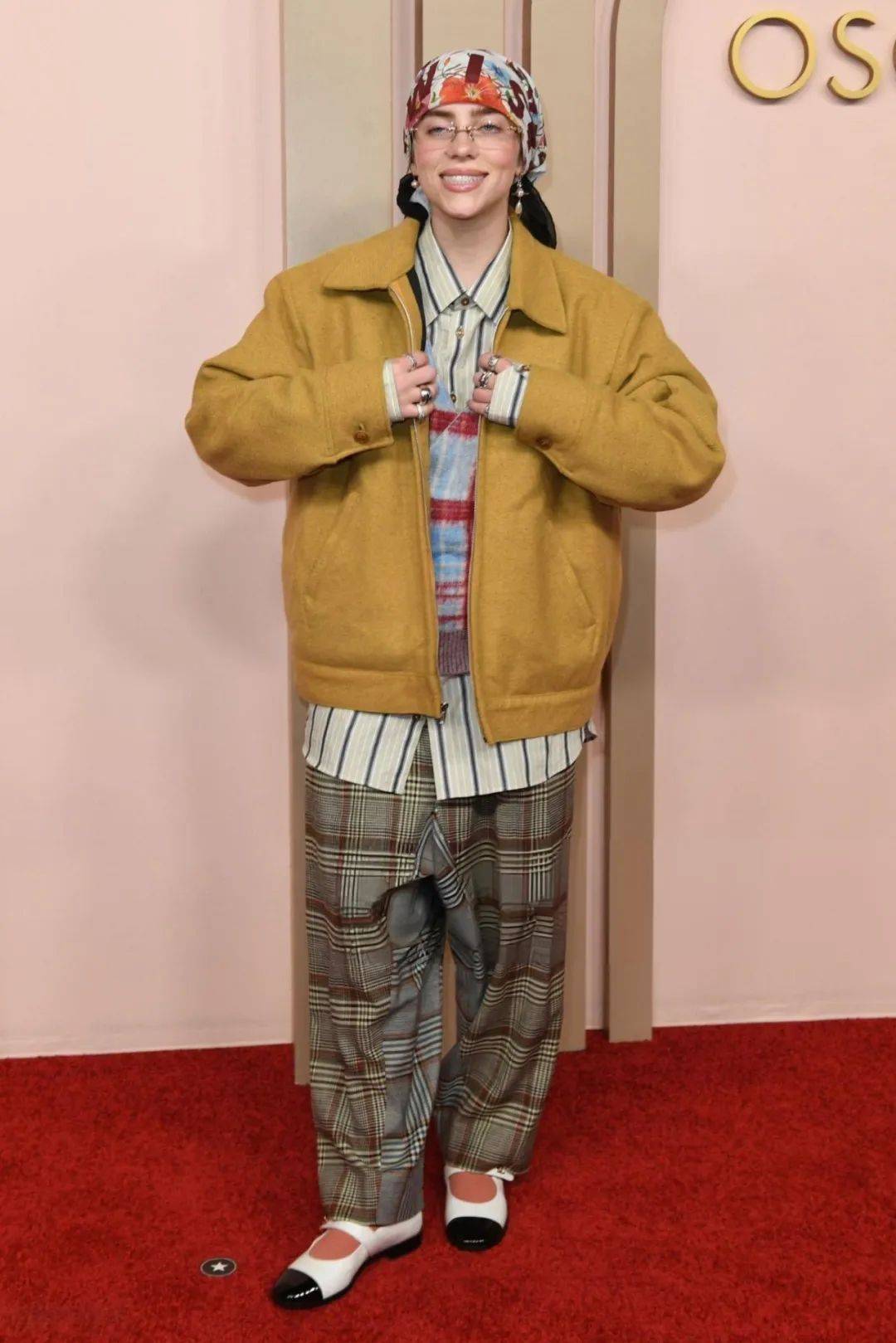 2024年奥斯卡提名午宴与颁奖典礼红毯上,Billie Eilish仿佛在玩大变活人。低调的纯色夹克之下,多种不同格纹单品暗藏玄妙,与彩色头巾顽皮呼应,Miu Miu拼色平底鞋不小心暴露假小子的少女心,藉无序感穿搭风格伸张自由主义。