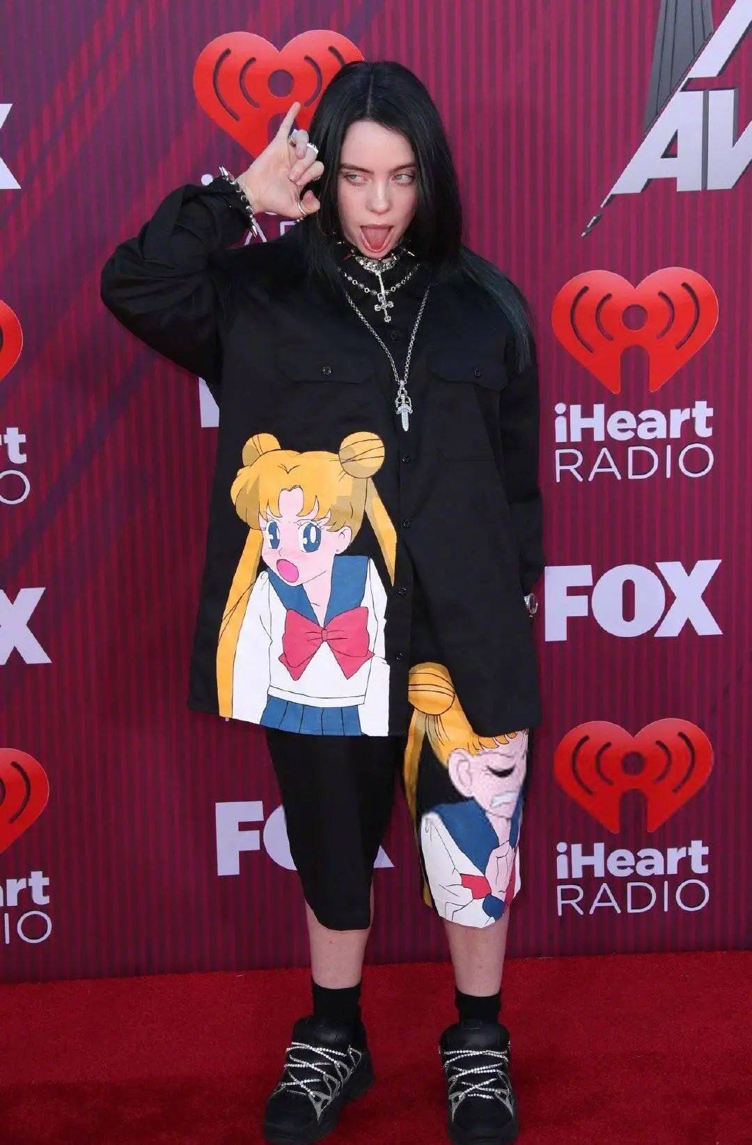 众多艺术成就加身,也使很多人忽略了Billie Eilish的年纪。其实这位风靡全球的“巨星”心中,依旧住着喜欢动漫的小女孩。在2019年的ASCAP流行音乐奖和iHeart Radio音乐奖上,她分别穿着飞天小女警和美少女战士印花服装,并把头发染成了更加“二次元”的黑色,向“男孩子气”形象发起冲击。锐利的金属配饰和利落的工装版型,巧妙中和卡通人物的圆钝少女感,打破由年龄和性别延伸的一切约定俗成。