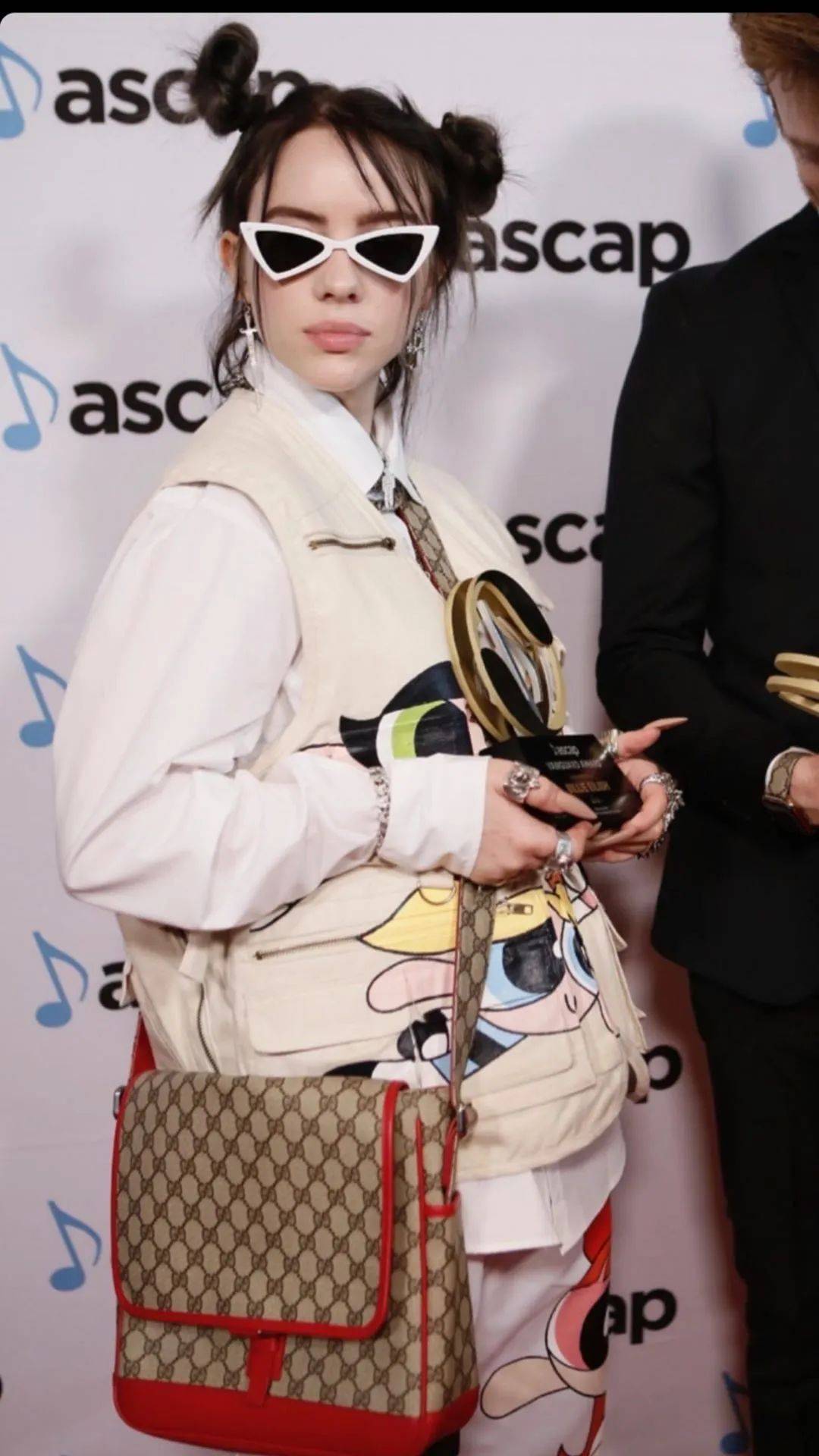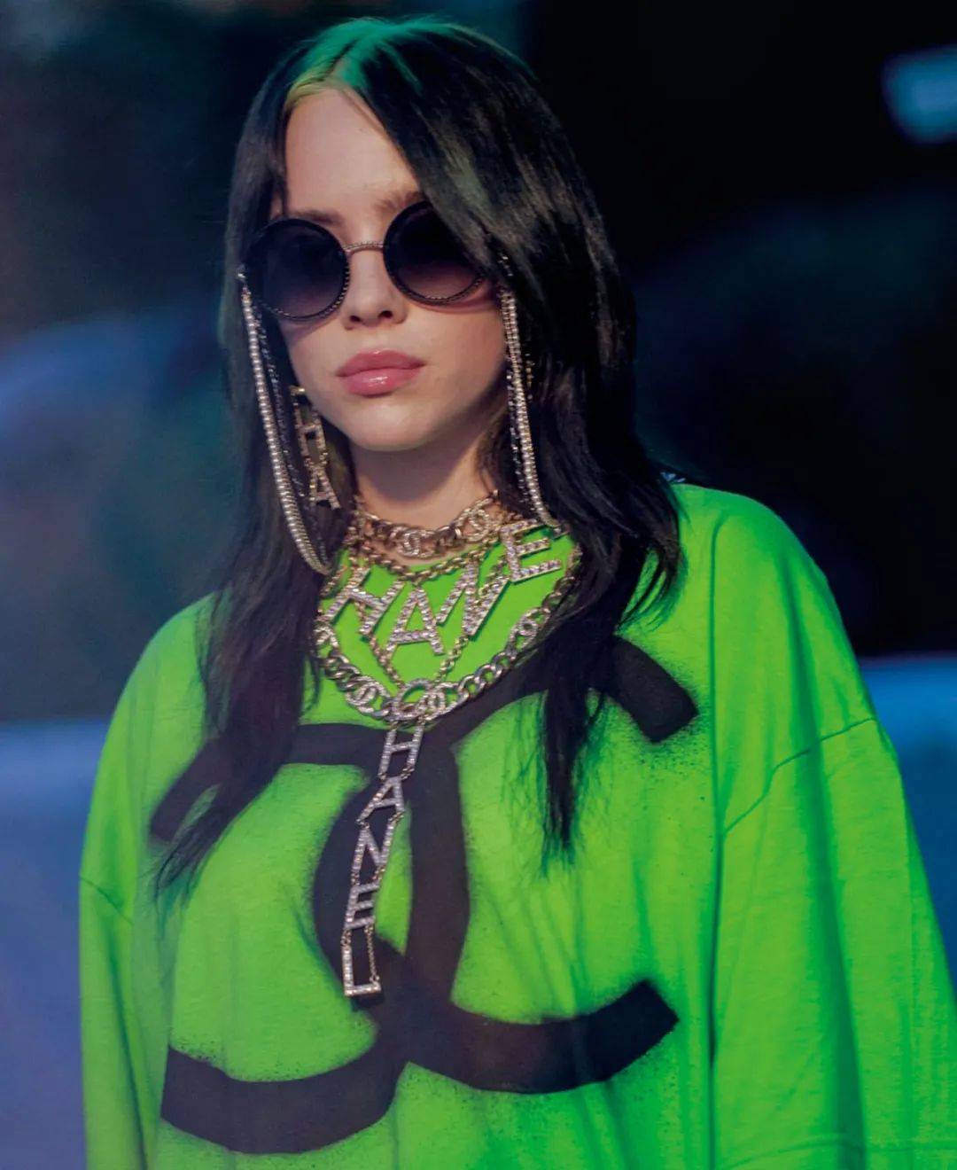 2016年,Billie Eilish因首支单曲《Ocean Eyes》走红,同年参加Young Hollywood 派对。众多潜力无限的新鲜面孔,争相以精心准备的造型博得世界的目光,她却像出门散步般松弛,头戴迷彩鸭舌帽,扎着两根麻花辫,超大号灰绿色T恤裙完全淹没身材,领口和衣角甚至起了毛边,脚蹬脏得发黑的Nike球鞋。绿色也是Billie Eilish最喜欢的颜色,纵使风格天翻地覆也不曾改变。