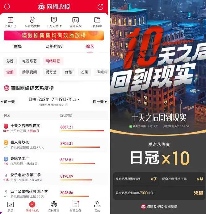 《十天之后回到现实》在猫眼综艺热度榜连续10天日冠
