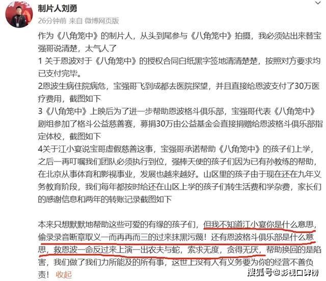 虽然王宝强工作室回应某俱乐部负责人举报欺诈一事,但是事件依旧没有平息,不断发酵。制片人刘勇坐不住了,发微博表示:我必须站出来替宝强哥说清楚,太气人了。他还晒出微信聊天记录,有银行卡账号,明细表。