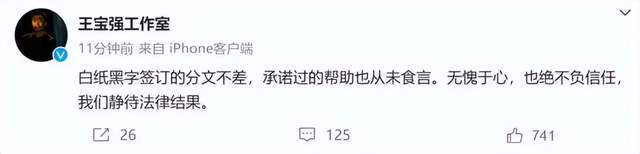 王宝强工作室11月21日晚上在微博回应:白纸黑字签订的分文不差,承诺过的帮助也从未食言。