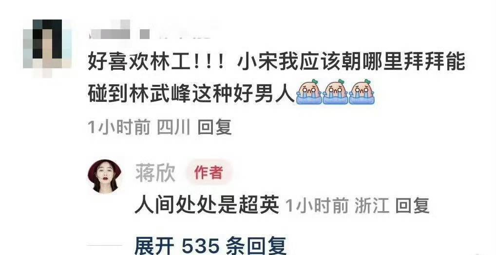 在电视剧《小巷人家》中,李光洁饰演的林武峰帅气优秀又会宠人,和蒋欣饰演的宋莹组成了一对令人羡慕的模范夫妻,而郭晓东饰演的庄超英则因为“愚孝”等行为频频引发争议。有网友提问蒋欣如何才能碰到林武峰这样的好男人,蒋欣辣评:“人间处处是超英”。