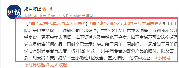 声明中,辛巴再次表态,他将拿出一亿针对三只羊的消费者进行赔付。