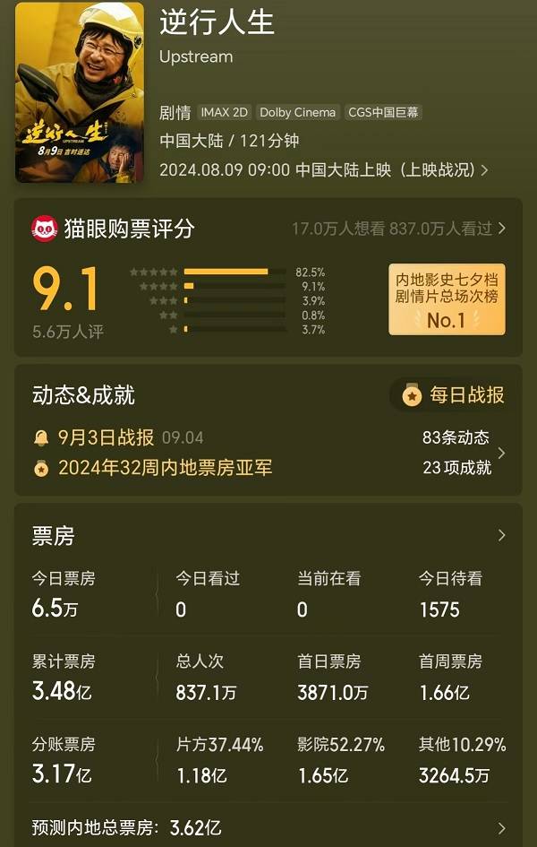 徐峥的《逆行人生》上映27天票房3.48亿元,投资方分账1.18亿元。猫眼专业版预测其最终总票房3.62亿元,投资方分账1.23亿元,大概率也是收不回成本的。