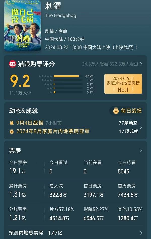 《刺猬》上映13天票房1.31亿元,投资方分账4515万元。猫眼专业版预测其最终票房1.47亿元,投资方分账5048万元。