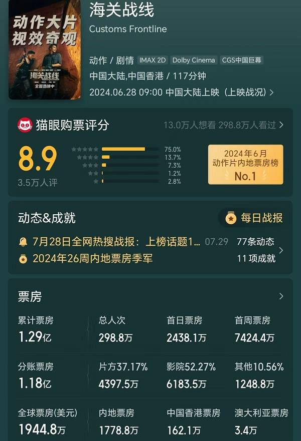 英皇主控出品,邱礼涛执导,谢霆锋、张学友主演的《海关战线》网传总成本超2亿元,票房1.29亿元,投资方分账4398万元,光看票房回收,净亏损可能超过1.5亿元。