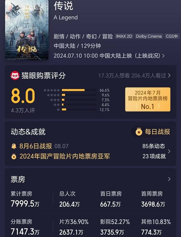 《传说》票房8000万元,投资方分账2637万元。如果总成本真的2.9亿元,算上后续网络版权、海外版权等收入,净亏损也可能超过2亿元。