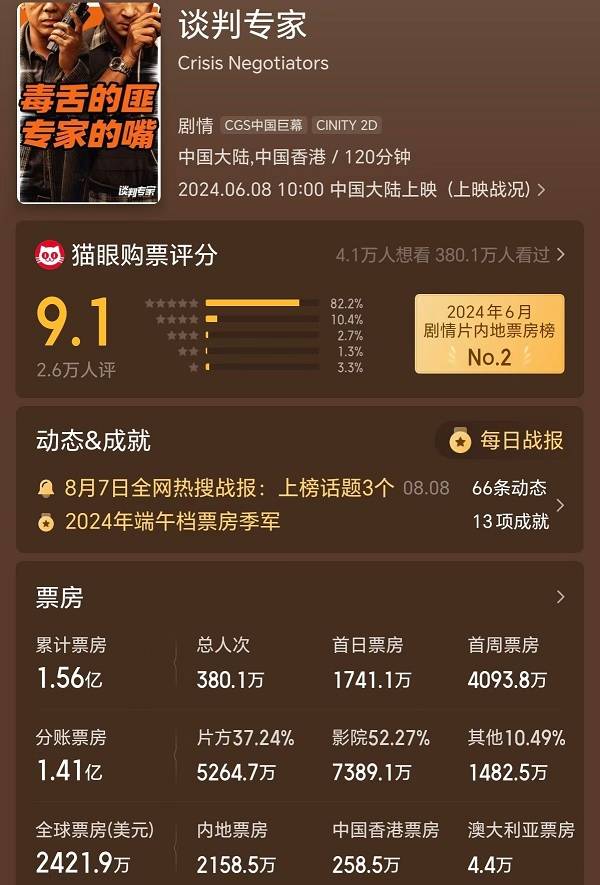 猫眼影业是这部电影的主控出品方和发行方,最受益。其他参投的出品方淘票票、中影、万达影视、横店影业等也参与分账。