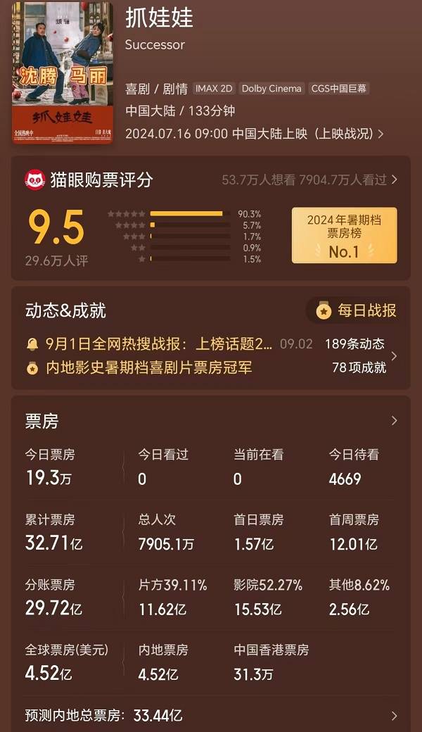 《抓娃娃》上映51天累计票房32.71亿元,投资方分账11.62亿元。猫眼专业版预测其最终总票房33.44亿元,投资方分账约11.9亿元。