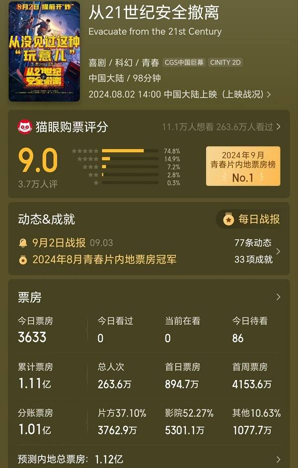 相比《解密》《异人之下》这样的头部大片,北京申城国际、光线影业、北京欢喜首映、大盛国际传媒出品的《从21世纪安全撤离》制作规模相对要小很多。不过,这部片票房只有1.11亿元,投资方分账3763万元,也很难赚钱,大概率亏损。