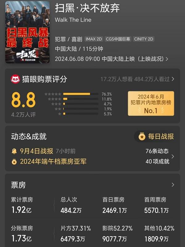 五百执导,肖央、余皑磊、范丞丞主演的《扫黑·决不放弃》票房1.92亿元,投资方分账6479万元,这部片成本少说也在1亿元上下,大概率亏损。