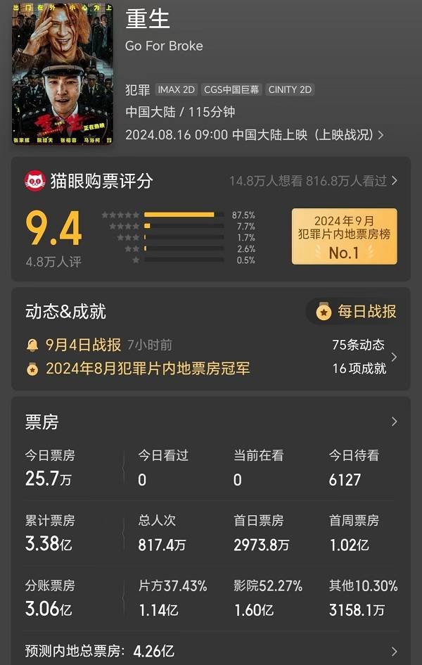 《重生》上映20天票房3.38亿元,投资方分账1.14亿元。猫眼专业版预测其最终票房4.26亿元,投资方分账1.44亿元。这部由张家辉、阮经天主演的犯罪片预计制作成本可能在1亿元上下,加上宣发成本,小赚、平、亏都有可能。