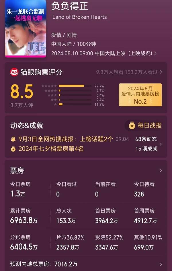 朱一龙、邱天主演的《负负得正》票房6964万元,投资方分账2358万元。