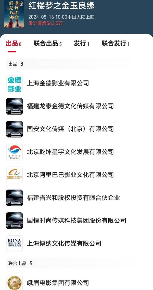 《红楼梦之金玉良缘》前几大出品方包括上海金德影业、福建龙泰金德文化传媒、国安文化传媒、北京乾坤星宇文化发展、北京阿里巴巴影业、福建省兴和股权投资、国恒时尚传媒科技集团、上海博纳文化传媒。