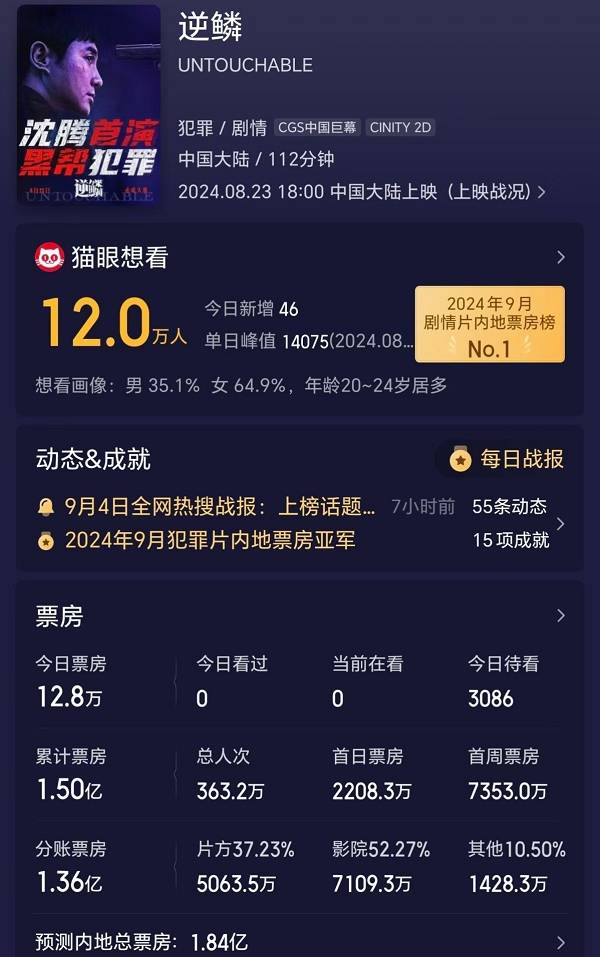 《逆鳞》上映13天票房1.5亿元,投资方分账5064万元。猫眼专业版预测其最终总票房1.84亿元,投资方分账6211万元,可能很难覆盖成本,还是亏损。