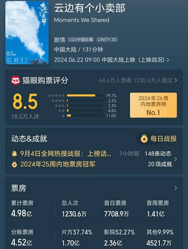 《云边有个小卖部》票房4.98亿元,投资方分账1.7亿元。