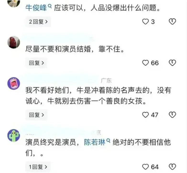 然而,陈若琳疑似跟牛骏峰谈恋爱的消息曝光,一部分网友却不淡定了,在牛骏峰的账号评论区留言“请不要伤害漂亮的陈教练”,尤其是陈若琳的粉丝,更不看好她交往娱乐圈小鲜肉,认定男明星花心、不靠谱,甚至自创打油诗喊话陈若琳“要清醒一点”。