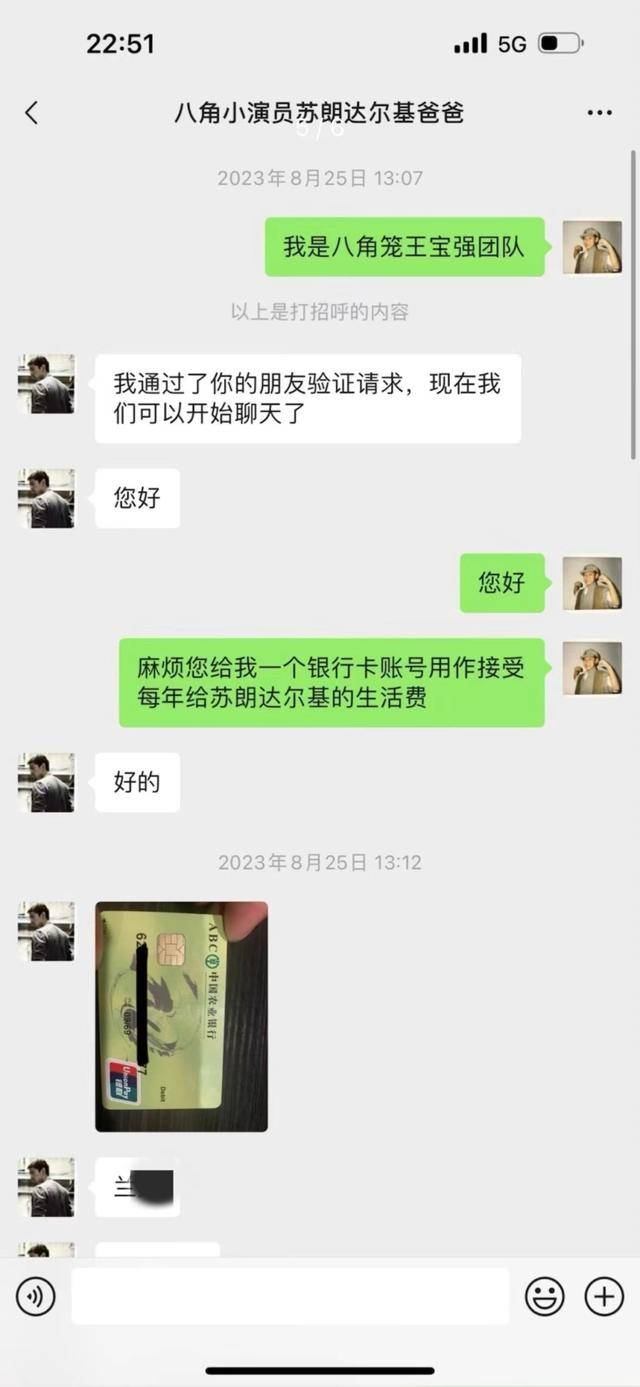 11月22日,九派新闻联系到刘勇所发聊天记录截图中《八角笼中》的小演员苏朗达尔基的父亲兰先生(化姓),其称自家孩子的确受到王宝强的资助,“小孩的学杂费、生活费都是他提供的。”他说,自《八角笼中》电影上映后,王宝强就一直对孩子进行帮助,从小学六年级资助至初一,已资助2年,共2万元左右。