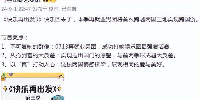 不过,这档节目的制作团队并不是芒果台,而是大千影业,估计一开始芒果台并没有看好“0713”的团综,才将这节目外包了,事实上,《快乐再出发1》招商并不理想,开始只有1个冠名商,整季节目也只录制了7期。
