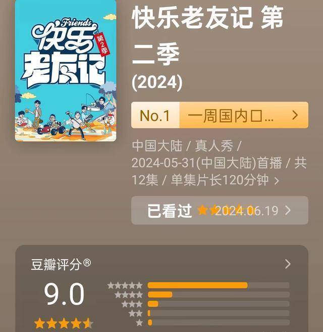两季团综的爆火,让“0713”再就业男团炙手可热,他们成了各种综艺节目的“香饽饽”,有点后知后觉的芒果台才以“娘家人”的身份,为“0713”打造了全新的团综《快乐老友记》,目前也播出了两季,豆瓣评分分别是9.1分和9分,虽然维持了高口碑,但比《快乐再出发》还是差了些。