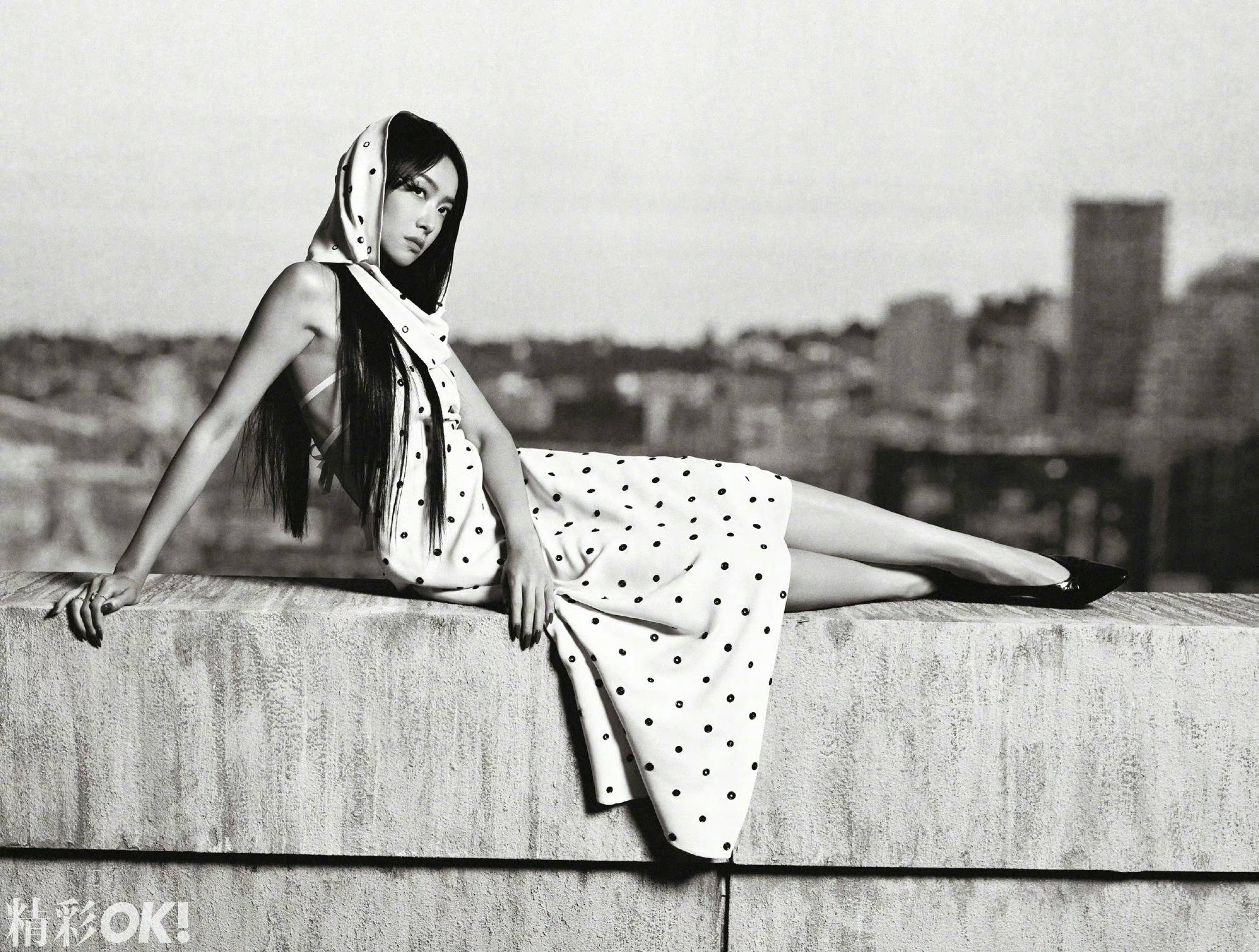 宋茜穿香槟色长裙,置身天台极具电影感。