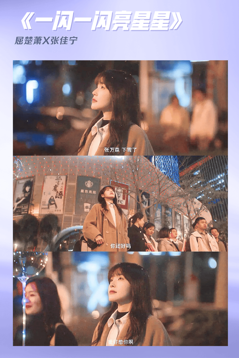 《一闪一闪亮星星》屈楚萧X张佳宁。题材新颖,是一部奇幻悬疑爱情剧,默默的守护与暗恋打动了很多观众,更是诞生了名台词“张万森,下雪了”。由此衍生的同名电影,甚至还出现了“下雪”场次,足见雪景在这部剧中的重要性。