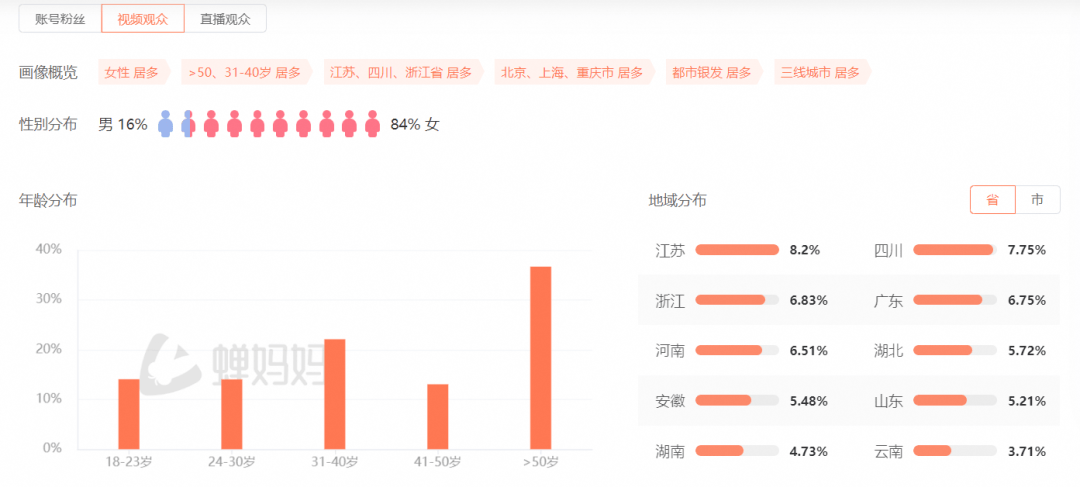 蝉妈妈数据显示,何晟铭的视频观众中,有83%为女性,有42.34%为31—40岁的用户;朱泳腾的视频观众中,有84%为女性,36.71%为50岁以上的用户;任重的视频观众中,有80%为女性,47.71%为31—40岁的用户。