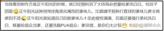 另有多数网友在线直呼举报,更有熟悉剧方的网友表示,正午阳光之前的一些剧集就陷入过 " 辱女 " 争议,例如在这部剧中,就有强行美化 " 爹味 " 的意图。随后,大批网友涌入官方评论区,纷纷提出质疑。