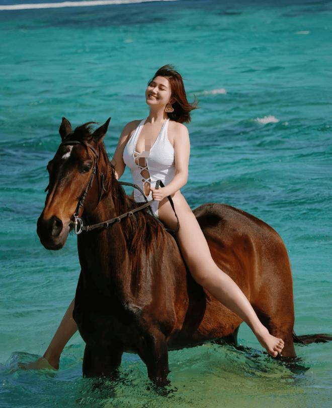 只见白云在马背上变换着各种姿势,蓝天白天、大海骏马、性感美女汇成一副让网友喷血的性感照!