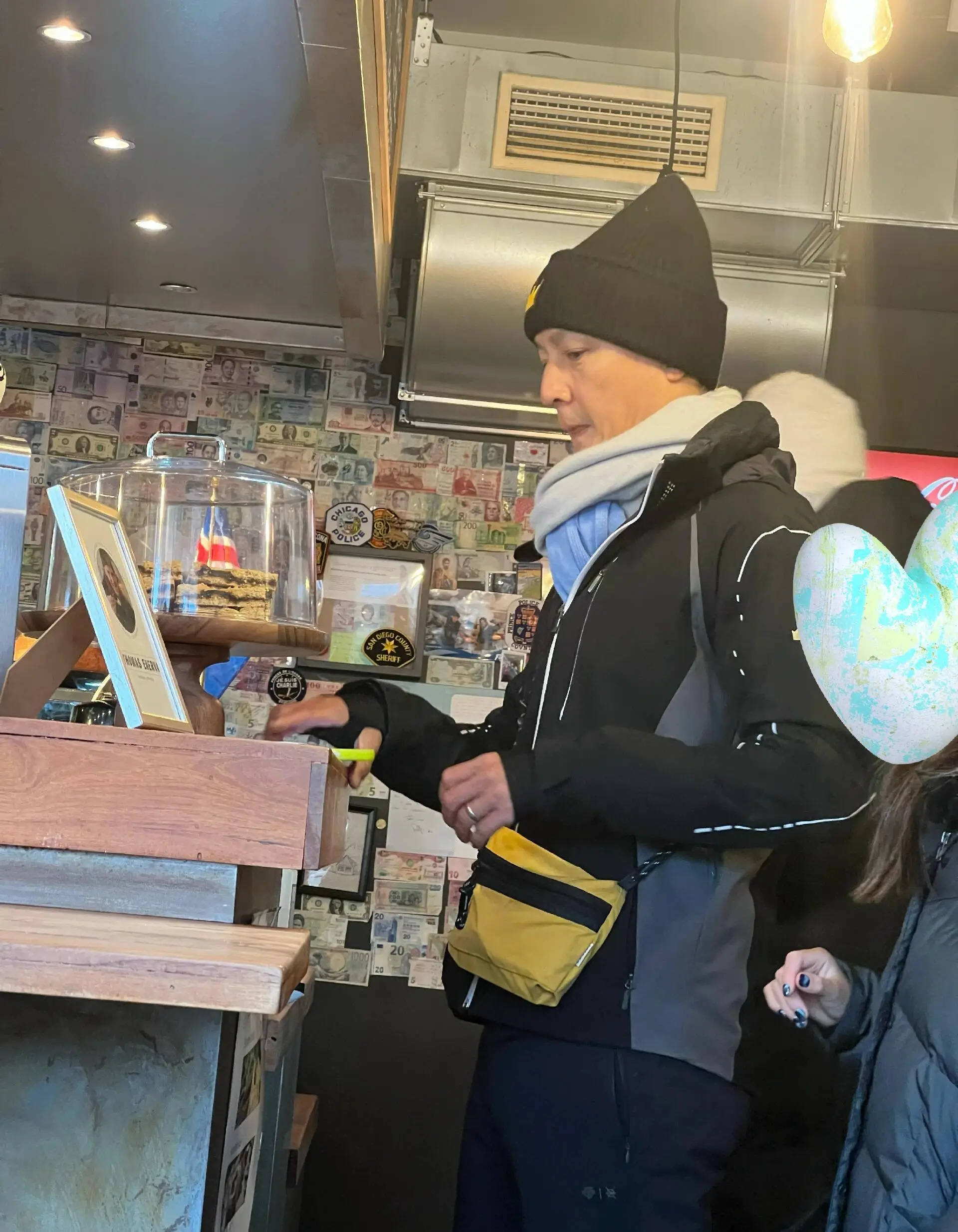 吴彦祖与家人在冰岛度假,在餐厅用餐时被网友偶遇,他正在前台取餐,戴着帽子和围巾,穿搭舒适又保暖。