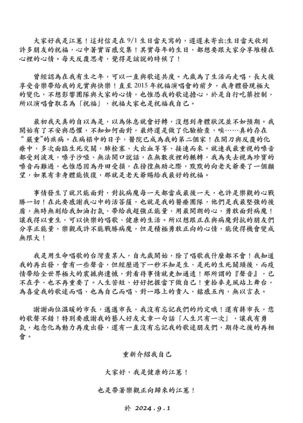搜狐娱乐讯 9月10日,中国台湾女歌手江蕙发布亲笔信,透露当年引退原因是罹患癌症,她表示:“多次面临生死交关,肺栓塞,大出血等等,接连而来。就连我最重视的嗓音都受到波及,嗓子沙哑、无法开口说话。”据悉,江蕙曾于2015年演唱会前宣布封麦退出歌坛。如今,江蕙宣布复出并将在10月5日登台北大巨蛋,她感叹:“人生苦短、把握当下做自己。”