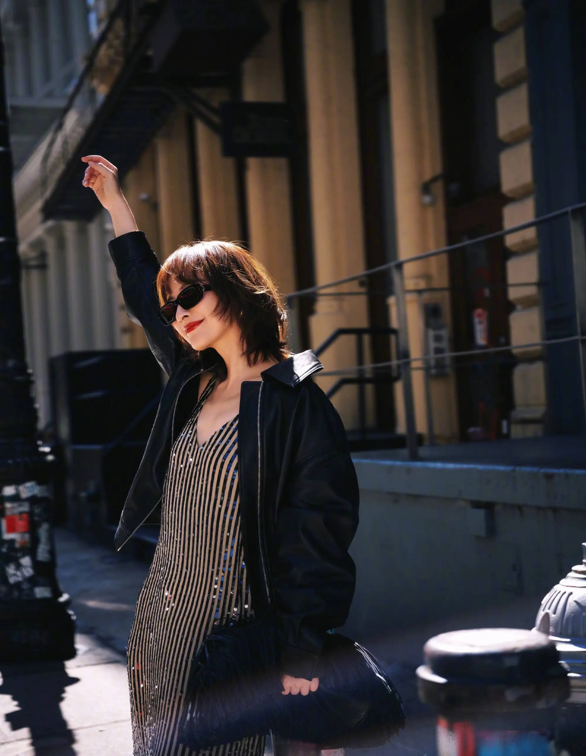 搜狐娱乐讯 11日,吴昕在社交平台上晒出自己参加纽约时装周拍摄的美照!她戴着墨镜,身着条纹亮片吊带裙外搭黑色皮衣,漫步纽约街头,超有摩登范儿!