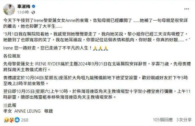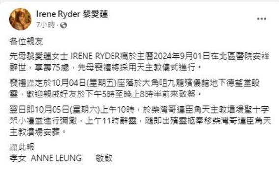 而梁小龙的前妻黎爱莲(Irene Ryder)于9月1日离世,女儿Anne Leung近日在社交平台公布了母亲的后事安排。