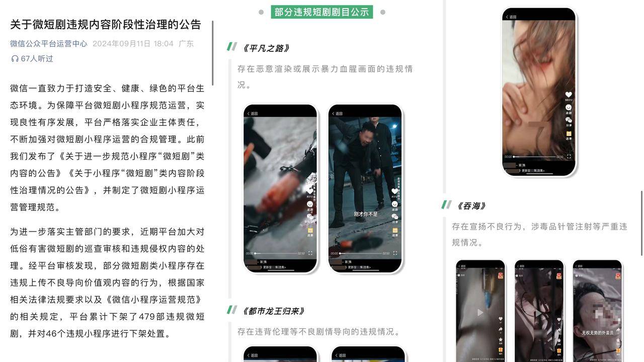 9月11日,微信公众平台运营中心发布公告称,近期累计下架了479部违规微短剧,并对46个违规小程序进行下架处置。