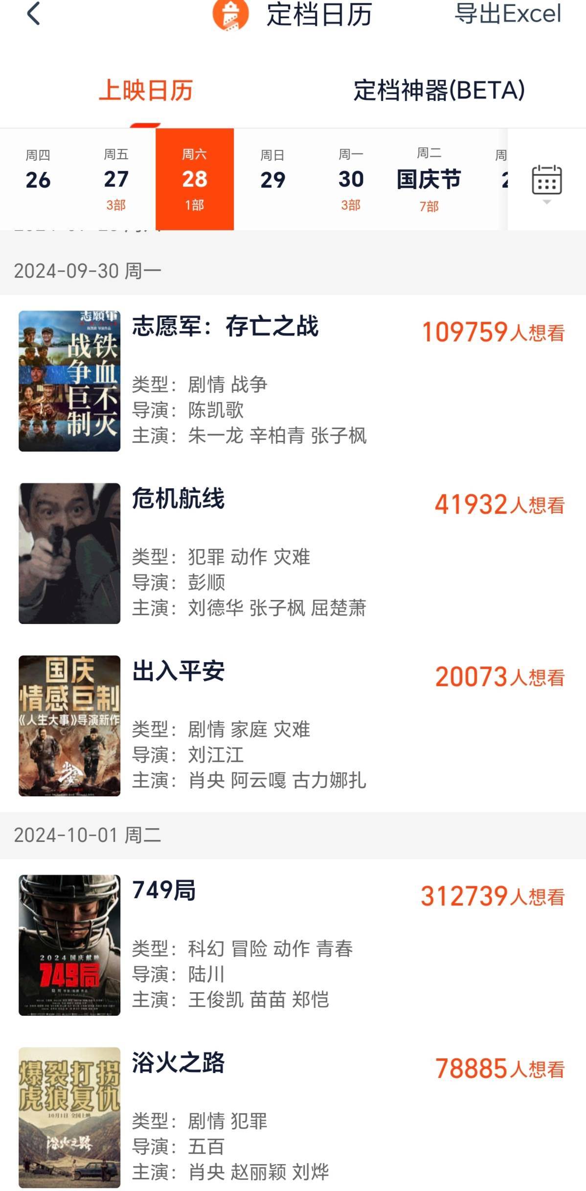 搜狐娱乐讯 (哈麦/文)随着陈凯歌《志愿军2》和陆川《749局》的定档,加上此前已定档的彭顺的《危机航线》、刘江江的《出入平安》、宁浩的《爆款好人》、五百的《浴血之路》、张栾的《熊猫计划》,以及《只此青绿》《新大头儿子和小头爸爸6》《皮皮鲁和鲁西西之309暗室》,国庆档新片多达10部。
