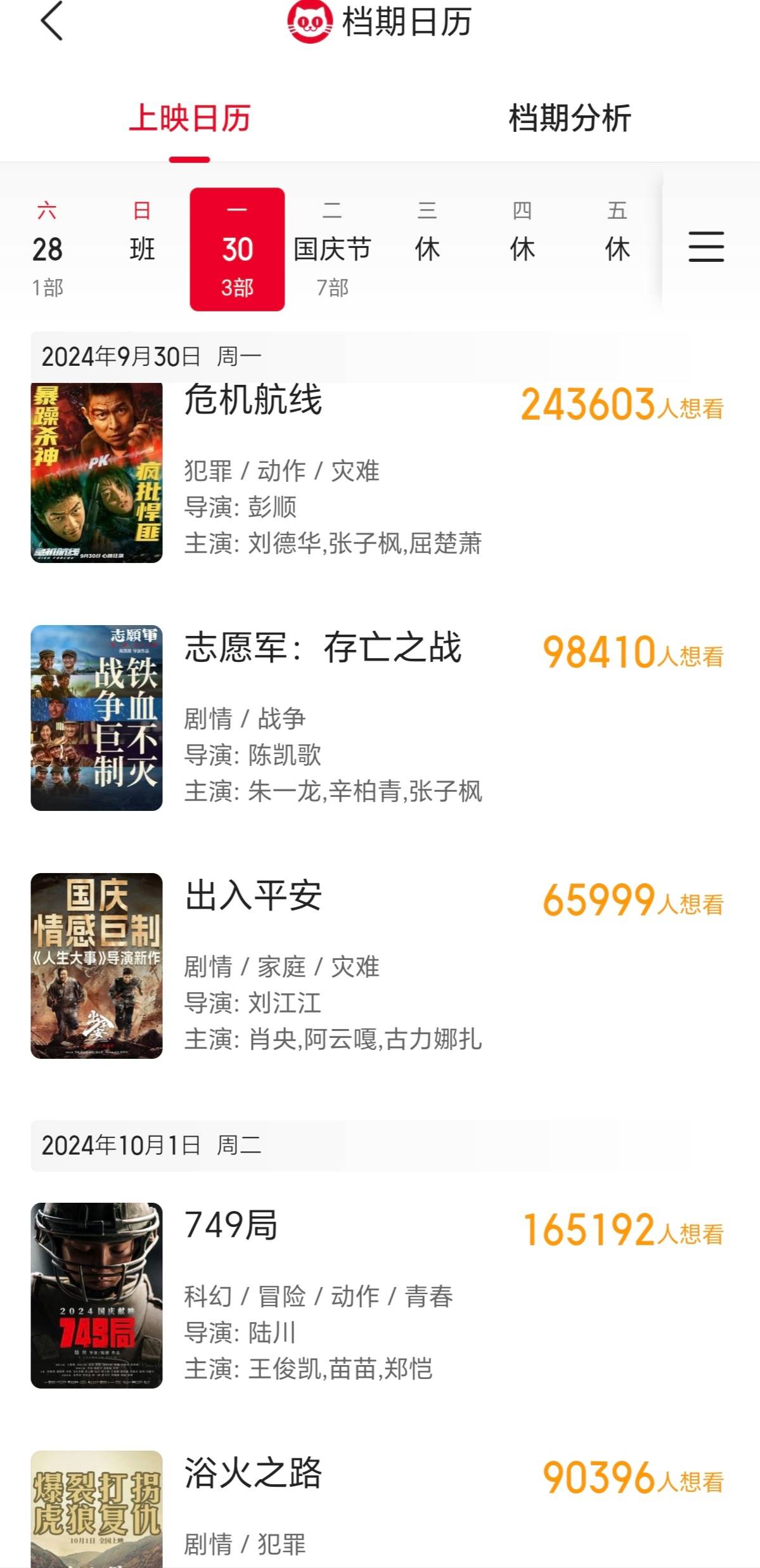 对比猫眼想看人数,刘德华、张子枫、屈楚萧主演的《危机航线》猫眼想看人数24.4万,排第一。王俊凯、苗苗、郑恺主演的《749局》猫眼想看人数16.5万,排第二。朱一龙、辛柏青、张子枫主演的《志愿军2》猫眼想看人数9.8万,排第三。肖央、赵丽颖主演的《浴火之路》猫眼想看人数9万,排第四。肖央、阿云嘎、古力娜扎主演的《出入平安》猫眼想看人数6.6万,排第五。成龙、魏翔主演的《熊猫计划》猫眼想看人数4.7万,排第六。葛优、李雪琴主演的《爆款好人》猫眼想看人数1.4万,在七部热门电影中垫底。